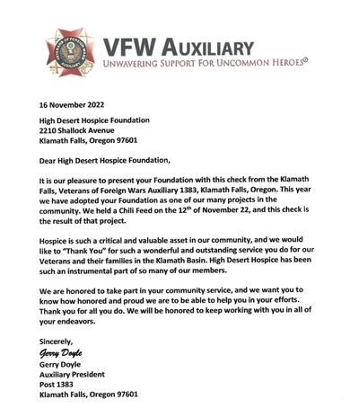 Klamath Falls VFW Auxiliary hosted a chili feed fundraiser on Saturday, November 12, and the proceeds were donated to Heart of Hospice Foundation. They wrote a beautiful letter to the Foundation with the proceeds from their fundraiser.